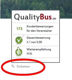 Auf der Detail-Seite eines Busreiseveranstalters befinden sich alle Informationen zu den abgegebenen Kundenbewertungen. Auf dieser Seite ist auch der Code zur Nutzung des QualityBus Widgets verfügbar. Unter dem Widget finden sie den Hinweis "Einbetten". Klicken Sie auf "Einbetten".